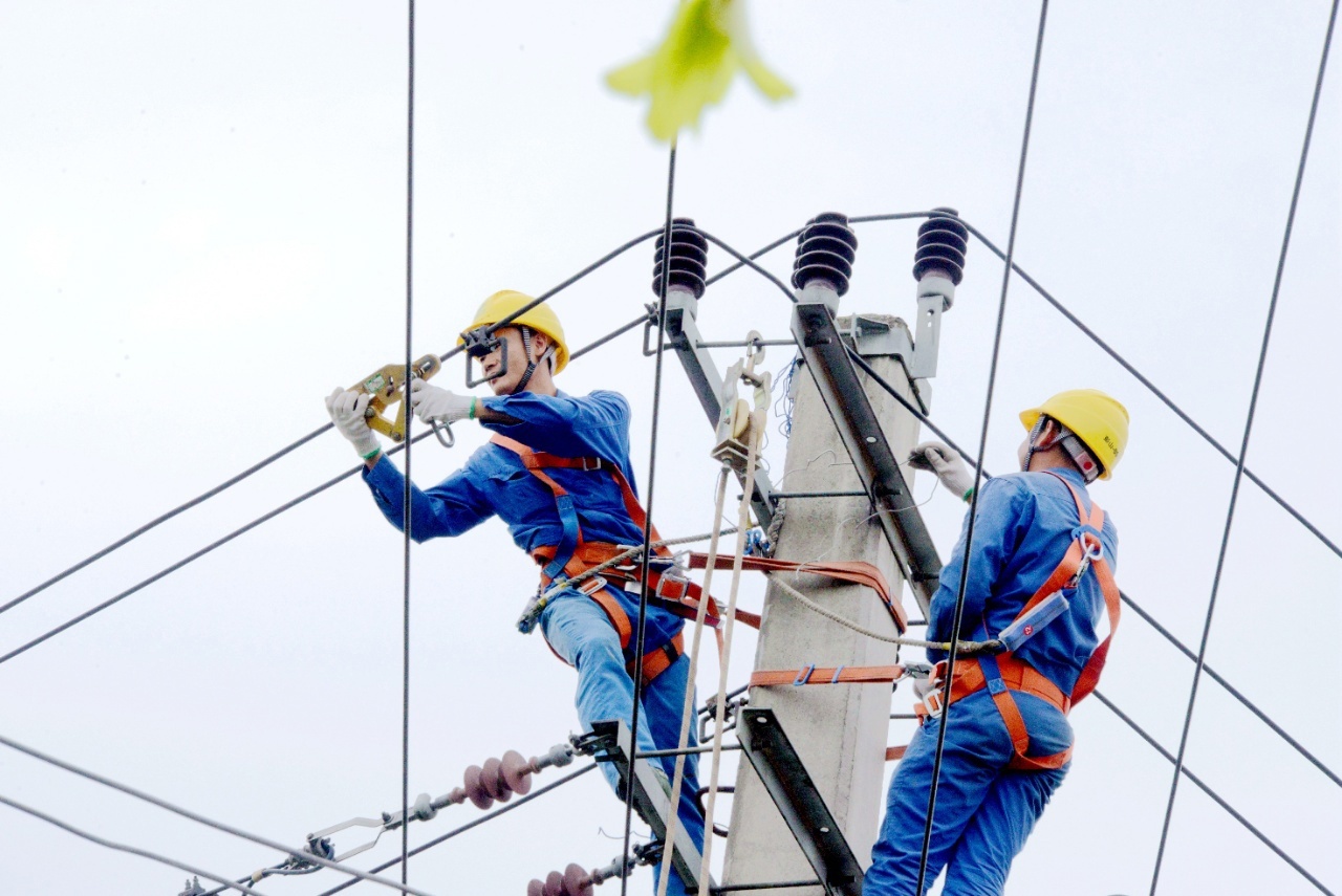 電力施工人員在電桿上作業(yè)。(李紅燕/攝)